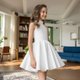 前身刻意保持极简风格——光滑结构化的缎面搭配高挂脖领口,干净利落地勾勒肩部线条。背部则呈现截然不同的风景:优雅的开背设计从领口延伸至腰部,腰间一个大型立体缎面蝴蝶结,线条分明,比例大方。这样的细节从任何角度拍摄都美不胜收。