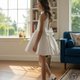 裙摆蓬松而富有建筑感——在自然腰线处收褶,剪裁至迷你长度,每一步行走、旋转和舞动都充满灵动飘逸之美。