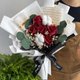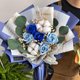 .花材包含香皂玫瑰花、棉花、尤加利叶、满天星…等等。