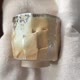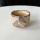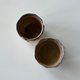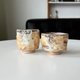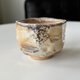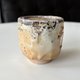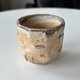 此款为浅色坯土所成形的切削杯,随意泼上志野釉后柴烧,呈现了温暖的奶茶色。迎火面微微结晶像雪花,又似絮状花纹,让作品有丰富变化又带有趣味。