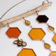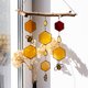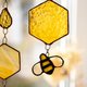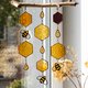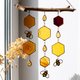 彩色玻璃蜂蜜和蜜蜂。 三个带有蜂窝的螺纹连接到横杆上。 横杆是天然树枝。 六边形之间是由波纹玻璃制成的“蜂蜜滴”。