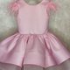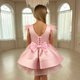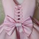 这款优雅的粉彩色缎面洋装,质感奢华且结构感十足,细节精致。无袖的胸前设计采用深V领的背部线条,点缀着典雅的缎带交叉绑带,增添了如紧身胸衣般的精致感。肩部装饰着柔软的粉色羽毛,流露出一丝娇嫩与俏皮。腰间饰有一朵大型的粉彩色缎带蝴蝶结,完美置于中央,衬托出腰部曲线。蓬松的裙摆由多层结构感缎面构成,内衬则为柔软的薄纱,营造出美丽的钟形轮廓。缎面材质柔和地反射光线,突显其优雅奢华的质感。