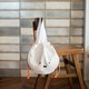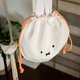 白色圆形的束口包上刺绣出 Miffy 的脸。