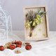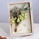Mini bouquet of dried flowers with hydrangea, lavender and blooming heather in a frame on a natural canvas. Have time to order timely gifts for your loved ones!