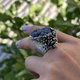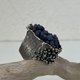 提升您的风格,佩戴这款大宽银戒指,镶嵌罕见的紫色玉髓(葡萄玛瑙)宝石。手工制作,带有颗粒纹理,这款艺术设计是独一无二的珍宝。