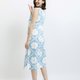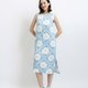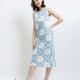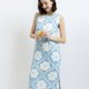 此款无袖长洋装采用棉麻混纺印花布料制成。