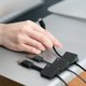 雾黑方块集线器利用几何美学与重力,有效收敛紊乱的充电线与耳机线。斜方切割搭配上胶囊型开孔,当平放在桌面上时,可稍稍垫高充电线,方便拿取。充电线头不再掉落桌脚、迷失在桌面。
