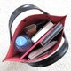 ◎这款托特包选用带有格纹压纹、厚实且坚固的红色缩纹皮革,搭配黑色提把与车缝线,整体风格简约时尚(^^