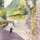 大人気の江ノ電の電車。近づいてくる江ノ電に大喜びする自転車を漕ぐ子供たち。