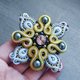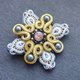 漂亮的胸针是采用饰带刺绣工艺制作的。材质:玻璃水晶、珠子、种子珠、饰带线。背面覆盖有皮革。轻的。尺寸:2.8寸(7厘米)。