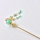 主要材料:飘花绿玉圆珠、东陵玉、捷克水滴珠、原色贝壳圆片、原铜色花片、原铜色簪杆等。