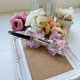 使用质感织带折成自行发想的蝴蝶结,蝴蝶结中心搭配精致的合金吊饰,上班和出游都适合使用,走在路上也不会到处撞款。