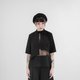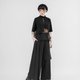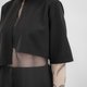 以西装布结合雪纺纱,透过材质的挺度与轻透感形成虚实交错的层次。立领线条简洁利落,胸前雪纺带出若隐若现的细节,使视觉更具深度。不对称活片与裁片剪接塑造立体结构,让整体在极简基调中仍保有鲜明的设计存在感,是春夏穿搭中兼具质感与造型的亮眼单品。