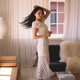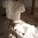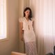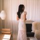 从特殊约会造型到时尚婚礼造型。 可爱又略带复古的氛围。 我想创造一种可以在日常生活中使用的婚礼造型。 粉白色套装将让您在特殊的日子中脱颖而出。 提花布料,宛如白色花瓣洒落在薄纱上,在阳光的反射下,散发出璀璨的光芒。 泡泡袖让手臂线条看起来非常纤细。 长裙散发出婚礼的优雅,而略微可见的腿部线条则产生了视觉错觉,使其看起来更加苗条。 如果是户外婚礼,我推荐稍微轻松的两部分婚礼造型。或者,如果您想在婚礼后盛装打扮去约会,您可以将其与舒适的 T 恤或裤子混搭。