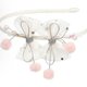 这是一款美丽的发箍,两个珍珠白星星网纱蝴蝶结,各缀着两颗粉色小纱球,并排在发箍上,还有小巧可爱的珍珠点缀其中,戴起来优雅有气质、甜美又可爱,参加喜庆场合、上台演奏表演、毕业典礼都好适合!