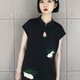 面布采用优质聚酯纤维醋酸缎面料,经过复合增加了一定厚度和挺括度,修饰身型;里布特地选用了绿色搭配刺绣图案里的草地,并且采用了和面布的内贴边缝合在一起的复杂工艺。在版型上,前片领口至胸前的裁片做了交叉结构设计,让传统旗袍领的水滴镂空更有层次感;整体较为宽松的版型加上略微收腰的结构包容更多体型;刺绣图案模拟手绣走线,生动有趣。艺术家原创赤目苑图案,灵感来源于《山海经》,它们好奇又害羞,善于隐藏自己和逃跑。