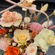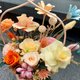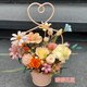 花材组合丰富,包括不同颜色和大小的永生玫瑰(黄色、橘色、浅粉色)、索拉花、满天星、绣球花以及各种干燥配花和绿色叶材。