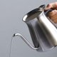 轻轻倾斜水壶即可顺利浇注,直到最后一滴水。手冲壶的底部和侧面之间没有焊接线,喷嘴和手柄也顺利连接入里,在在显示对细节的重视。