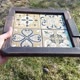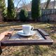 这款小木质方形托盘非常适合早晨在床上喝咖啡或在外面喝杯茶和饼干!:) 木材涂有油,突出了独特的木质图案。瓷砖是使用压克力涂料手工绘制的。