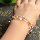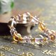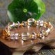 8×5毫米玻利维亚淡紫水晶算盘珠同11毫米精磨白水晶圆珠串联而成的手串,以上水晶晶体几乎达到高透光近净体等级。在光照下呈现均匀明亮的玻璃光泽,特别融入两颗10毫米黄水晶圆珠作为色彩点缀,晶体内部仅含极少冰裂纹与絮状包裹体,保持天然水晶特有的生长印记。金属配件全部采用纯银镀金工艺,包含精致的花托、隔片,小圆珠与算盘珠造型。金白配色与水晶透质感形成巧妙呼应,珠体经过多道抛光工序呈现饱满弧面。不同形态珠子的组合增强视觉层次感,当光线穿透晶体时会产生柔和的折射光斑。转动间金属配件与水晶交织出灵动光晕如初雪凝于腕间,又似朝露缀满花枝,这串手链将天地灵气凝练成方寸之间的诗意。