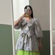 镂空 V 领衬衫,由 2 块荷叶边布料叠层 + 透明网纱裙。