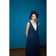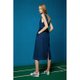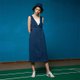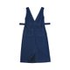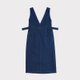 整件裙子大线条设计,细节结构合体修身,腰带两侧的蝴蝶结可以二次调节腰身,穿着更为舒适。面料是特别定织的色织牛仔,带有轻微弹力, 不同于市场上常见的白纱为底,此款表面是蓝色纱线,底面是黑色纱线,双面双色织法。洗水后颜色柔和均匀,质地细密骨感,稳定性极好。