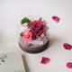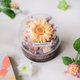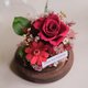 此为泡泡圆球复古木底座的玻璃盅卖场,此卖场放节庆使用的永生花或是特殊款