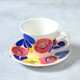 磁器 カップの径8.4cm高さ7cm ソーサの径14cm 真っ白な磁肌にローズピンクと黄色の椿花と青い色の葉を描いたカップ&ソーサです。 同じ色彩を使っても、磁器と陶器は違いがありますね。 磁器の絵付けで気を使うところは、シールを貼ったような無味乾燥なキレイさが主張しすぎて、手作りの味わいが失われないようにするところです。 これは色の濃淡があり、手描きが伝わります。