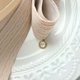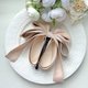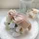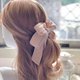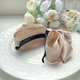 使用单面针织提花织带、折成自行发想的独特蝴蝶结,夹体搭配素色及韩国进口古典色系的织带,最后在其中一边蝴蝶结尾端加上小巧闪亮的圆形合金吊饰做装饰,看起来浪漫又立体显眼,走在路上不会到处撞款。