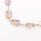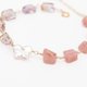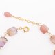这款手链采用 14kgf 材质,结合了色调柔美的紫水晶、芭乐石,以及蝴蝶造型的淡水珍珠。