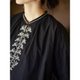 矮矮的中式小立领,将脖拉的长长滴。连着领的门襟,有大片的绣花工艺,中式的宋锦图案的花纹,用幽静的黑色绣花来衬托这抹白的温柔,朵朵立体且细腻,相交攀附在门襟在领口处。套头式的门襟,中间开三粒扣的宽度,再融入几粒黑色的小纽扣,不打破绣花的秩序感,且方便套头。