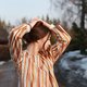 有一定圆润感的A型上衣 弧线下摆收边 落肩袖。大货的袖子比模特的长3厘米 有点日系风,又有点欧洲田园风 自然,清新,古朴的美感 **面料** 日本进口咖色渐变色条纯棉面料 里布用的是真丝妙,超薄丝滑 贴身穿非常舒服 **尺寸** S 胸围106 衣长64 肩宽无限制 袖围37 M 胸围110 衣长65 肩宽无限制 袖围38 L 胸围114 衣长66 肩宽无限制 袖围39 *模特穿的是L 这款衣服微宽鬆,冬季可以在里面穿保暖内衣或者打底衣
