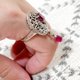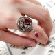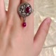 🛑 在繁复的镂空雕花中,天然红宝石静静绽放,如吊坠般悬浮于指间——整体以925纯银打造,精致镂空工艺呈现出典雅的复古质感,展现出刚柔并济的设计语言。红宝石象征热情、爱与力量;红宝石色彩强烈且散发红色萤光,宝石内微细的针状内含物,将本身会消散的光线重复反射至宝石内各个刻面,使红宝石具有独特加天鹅绒般的柔和感。
