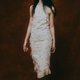 此款选用特殊的手工剪花面料。 搭配中式旗袍领型,创造古新结合的碰撞。 后颈衔接橄榄绿绒面缎带作为亮点。 合身衣形凸显曼妙曲线。 下摆流苏增加天然灵动性。 后中心开衩便于行走。