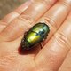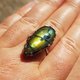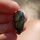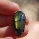 拉长石戒指。乌鸦或乌鸦环。就像维京戒指。油画微型画。漆微型画。