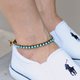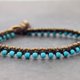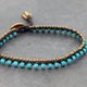 这是手工编织的脚镯,由深棕色打蜡线和圆形绿松石和黄铜珠编织而成。使用黄铜按钮关闭