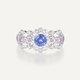 两侧点缀着粉红蓝宝石与细钻,星子般的闪烁沿着蕾丝花边错落排列,让整体更显层次与浪漫。