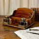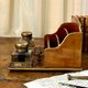 ⚠️ 状况说明:保存极佳的古董老件。胡桃木质地密实稳定,完全无虫蛀、裂痕或结构性缺陷。两只水晶墨水瓶状态优异,边缘锐利且瓶身无嗑伤、无明显磨痕,内壁保留的原始墨迹更添真实历史感。瓶盖黄铜包浆醇厚均匀,与整体金属部分的岁月氧化痕迹共同叙述着这件作品的传承价值。