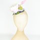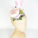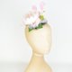 大型淡粉色牡丹和羽毛,辅以薄纱和树叶。黑色底座直径约10厘米,作品直径21厘米(含羽毛),高9.5厘米。用金属发夹固定在头发上。