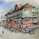 • 以针笔勾勒建筑线条,结合淡彩上色,层次自然柔和
