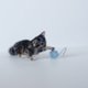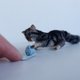 一只舔着爪子的小条纹猫。这个微型玩具是由天然羊毛制成的。玩具内部有一个铁丝框架,所以尾巴和爪子的位置可以稍微改变。
