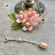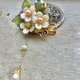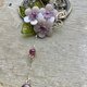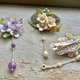 主要材料:天然贝壳片(原色、染色)、铜质花片(镀色、原铜色)、铁质鸭嘴夹、天然紫水晶、天然淡水珍珠、捷克制琉璃叶片。