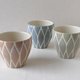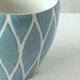 落ち着いたブルーグレーの表面に、掻き落としで描いた網目模様が映えるカップです。同じデザインの色違いも取り扱っていますので、色違いで揃えても。