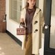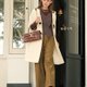 选用pu棕色皮质包边装饰,加上同色系的皮质牛角扣,质感满满,细节满满,帽子的设计中和了皮质带来的酷感,带有一些俏皮可爱 。