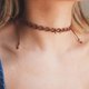 本系列灵感来自于蕾丝花纹,设计上于颈绳位置编织了仿蕾丝的花纹,配合了水滴形镀金珠,尾绳可绑成蝴蝶结,可放在前颈或后颈,随个人喜好配戴。
