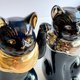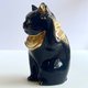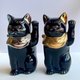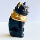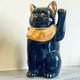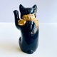 本件作品非常简约,猫身没有多余的色彩及花纹,散发着高级感,与一般招财猫相当不同,也造得更像一只猫,风格独树一帜。黑猫在日本一直作为“福猫”,象征着避邪、除厄、幸运、商业繁荣,而举起左手的招财猫是一只邀请人们进来的猫,金色领巾更加强了财运!