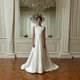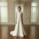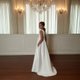 这款连衣裙采用奢华的象牙白色缎面精制而成,光泽柔和自然。无袖紧身胸衣采用纯粹经典的款式,领口和腰部点缀着精致的珍珠,更添精致贵族气息。从腰部开始,整齐的褶皱汇聚成优雅的A字长裙,裙摆则以纤细的裙摆优雅垂坠至地面。缎面面料散发着精致的哑光光泽,展现其柔滑丰富的质感和飘逸的垂坠感。