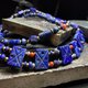 使用古时候代表权利的青金石为主,点缀上红色的南红玛瑙与绿色的老琉璃。青金石为手工雕刻的老件,非现代机器雕刻。金属部分为黄铜与纯银。如果您对市售的印第安风格感到腻了,可以尝试看看这条带有浓厚神秘古文明风格强烈的项链。