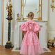蓬松的裙摆缀有两层闪粉薄纱,赋予其闪亮而富有层次的质感。领口和袖口的荷叶边采用柔软的薄纱,亲肤舒适,确保穿着的细致触感。透过精湛的缝纫工艺,洋装突显了刺绣和珠饰织物本身立体而自然的优雅。