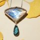 材料:天然印度料双色拉长石、伦敦蓝石英石、999纯银线、钛钢链 拉长石大小:26.43X40.9mm 项链长度:45+5cm 吊坠长度:5.2cm